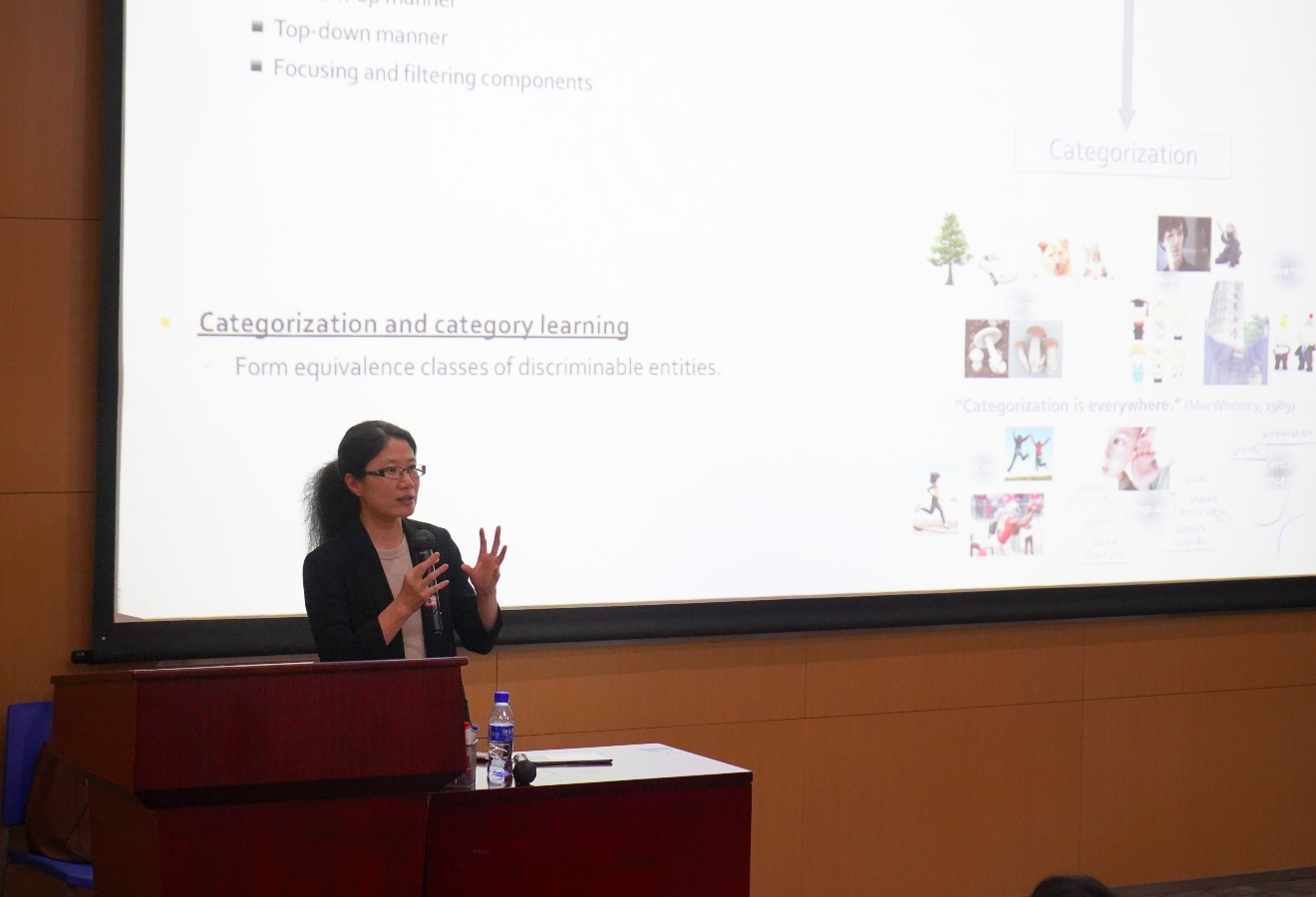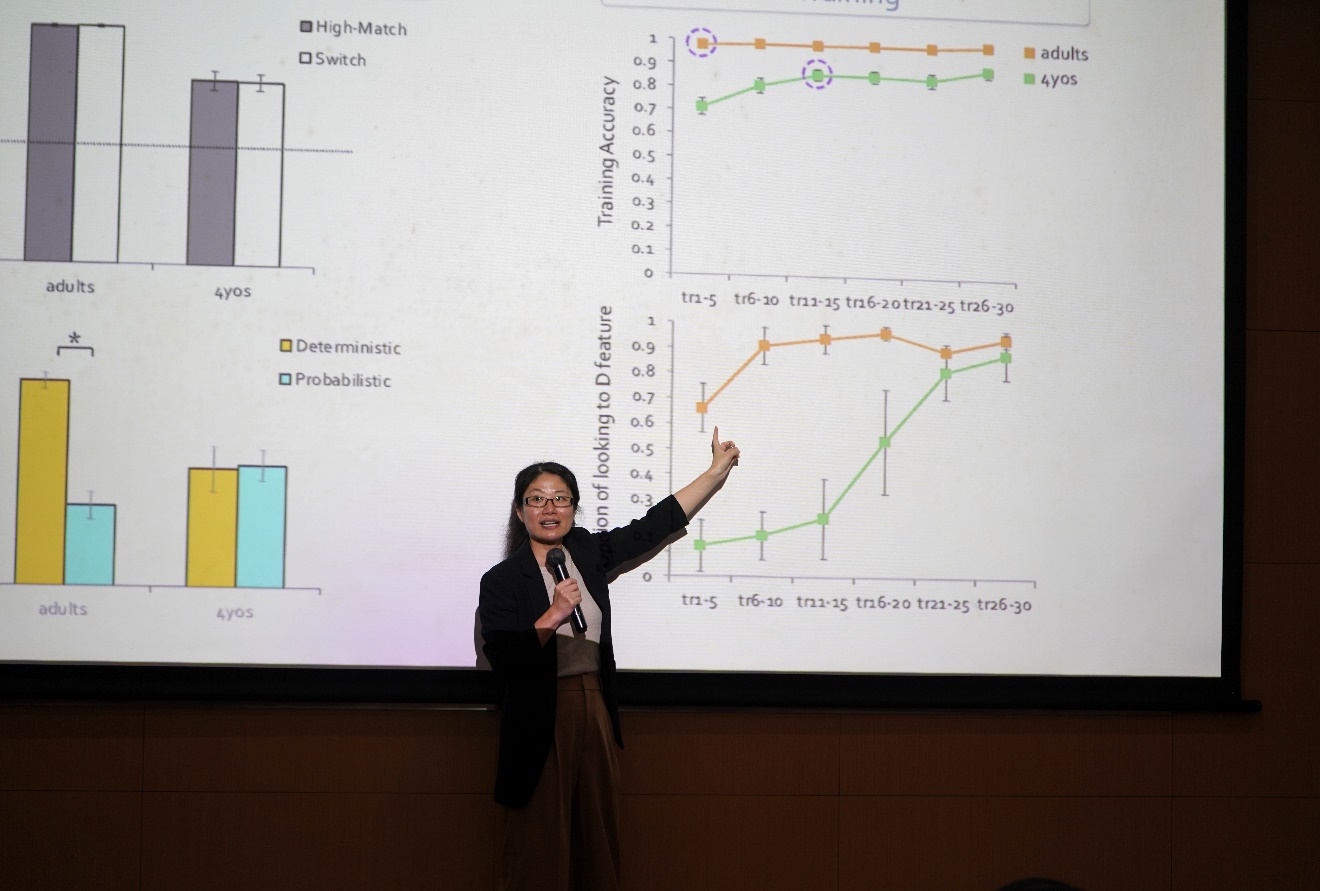 讲座中,邓博士首先为在座学生科普了选择性注意与归类学习的基本概念,以及它们应用于日常生活中的重要性。邓博士深入浅出地讲解了归类学习实验范式的设计和研究方法,并通过分享了她课题组的一系列实验研究成果,向大家层层剖析了儿童与成人在归类学习时的发展机制差异。邓博士的研究发现,儿童在分类学习过程中更倾向于广泛的注意,而成人则更高效地过滤出最重要的部分。在介绍到如何解读儿童归类学习的表现时,邓博士特别强调,儿童这种极具包容性的信息处理方式,实际上反映出学习和适应能力的潜能,为儿童的成长提供了更多的信息和视角。