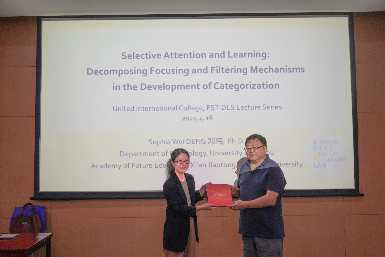 2024年4月17日,澳门大学心理学系助理教授邓玮博士来访UIC,以"选择性注意与学习"为题开展讲座,为师生介绍了在儿童发展的过程中,选择性注意如何通过聚焦和过滤机制影响归类学习。