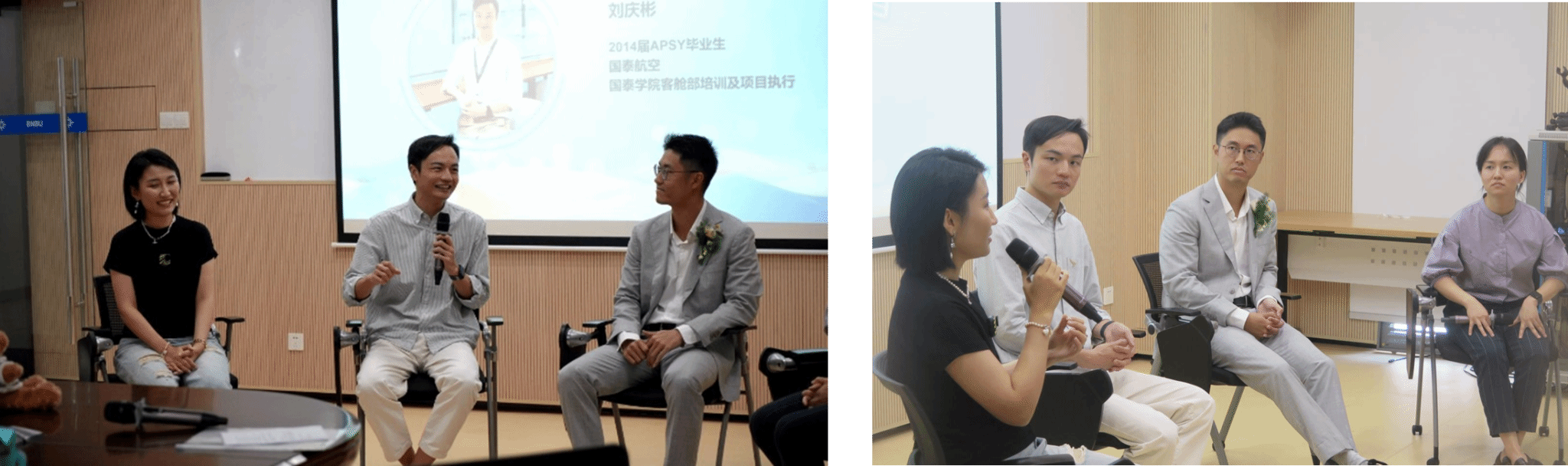 在第一轮分享中,刘庆彬、戴健进与董征三位校友从自身这一路经历出发,讲述了多元的职业路径。刘庆彬学长分享了从国际航班空中乘务员到客舱部培训及项目执行工作的转变,鼓励在读学弟学妹们拥抱一切可能性。戴健进学长以蜜蜂科技(BEEPLUS)联合创始人、蜜蜂发展总裁的视角,表示当年创业也得益于北师港浸大的多元文化人才环境,强调了应用心理学人才就业的突出品质与企业看中的员工职业素养。董征学姐的工作路径融合了变与不变,不变的是学姐一直走在产品营销的前沿创新之路上,变化的是应用心理学人的适应性及能力使得学姐能够从容面对从Vivo到Insta360的各大企业期待。他们的工作看似脱离了应用心理学的轨道,但是“有人的地方就有心理学”,他们运用在专业内所学的知识、在BNBU培养的语言能力、沟通技巧与思辨精神,在不同赛道上游刃有余。他们也鼓励在校同学勇于尝试,敢于探索,更要“坚持、坚持、再坚持”。
