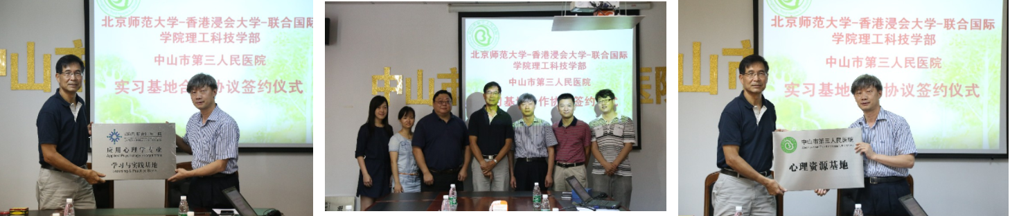 2015年6月10日,应用心理学专业与中山市第三人民医院实习基地合作协议签约仪式举行。双方商议安排对临床心理学有兴趣的应用心理学同学到医院实习,而医院具有丰富临床经验的医生也会来到UIC,为同学们介绍中国临床心理学应用和发展的现状。