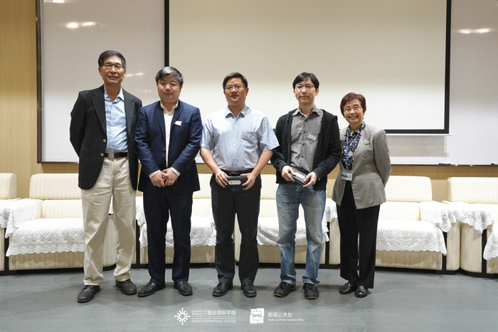 UIC副校长关利平教授(右一)、理工科技学部院长钟森文教授(左一)为三位嘉宾赠送纪念礼品
