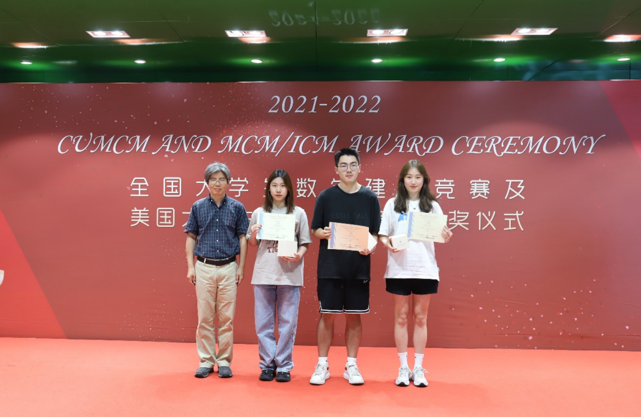 Prof Pan Jianxin presents awards to National Second Prize winners in CUMCM: Zhang Junrong, Huang Moyuan, Yin Jiaying (from left to right)
