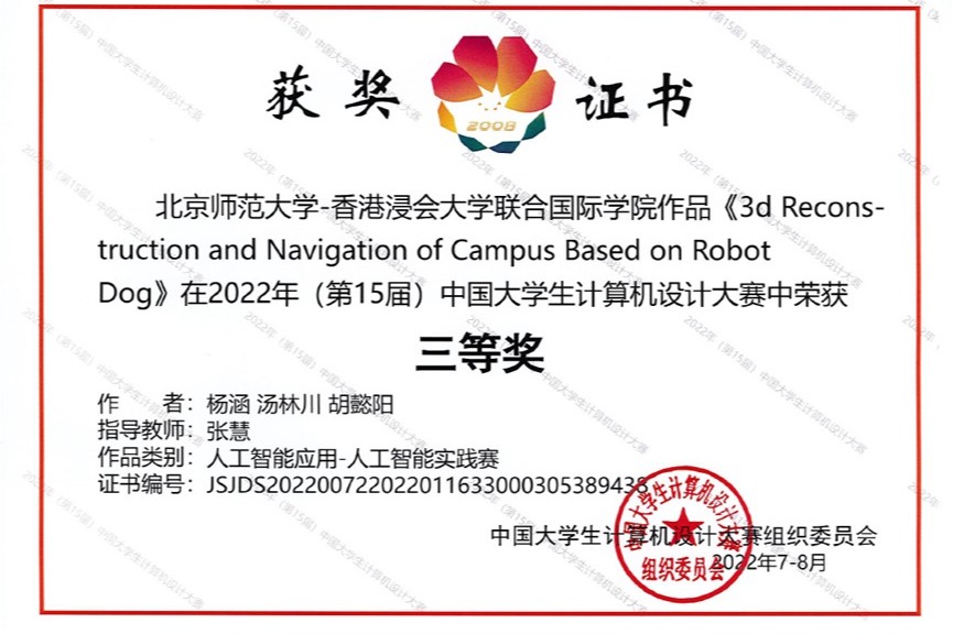 Three UIC students of the Computer Science and Technology Programme: Yang Han, Tang Linchuan and Hu Yiyang, designed a work named “3D Reconstruction and Navigation of Campus Based on Robot Dog”, winning the third prize at the 2022 China Collegiate Computing Competition.