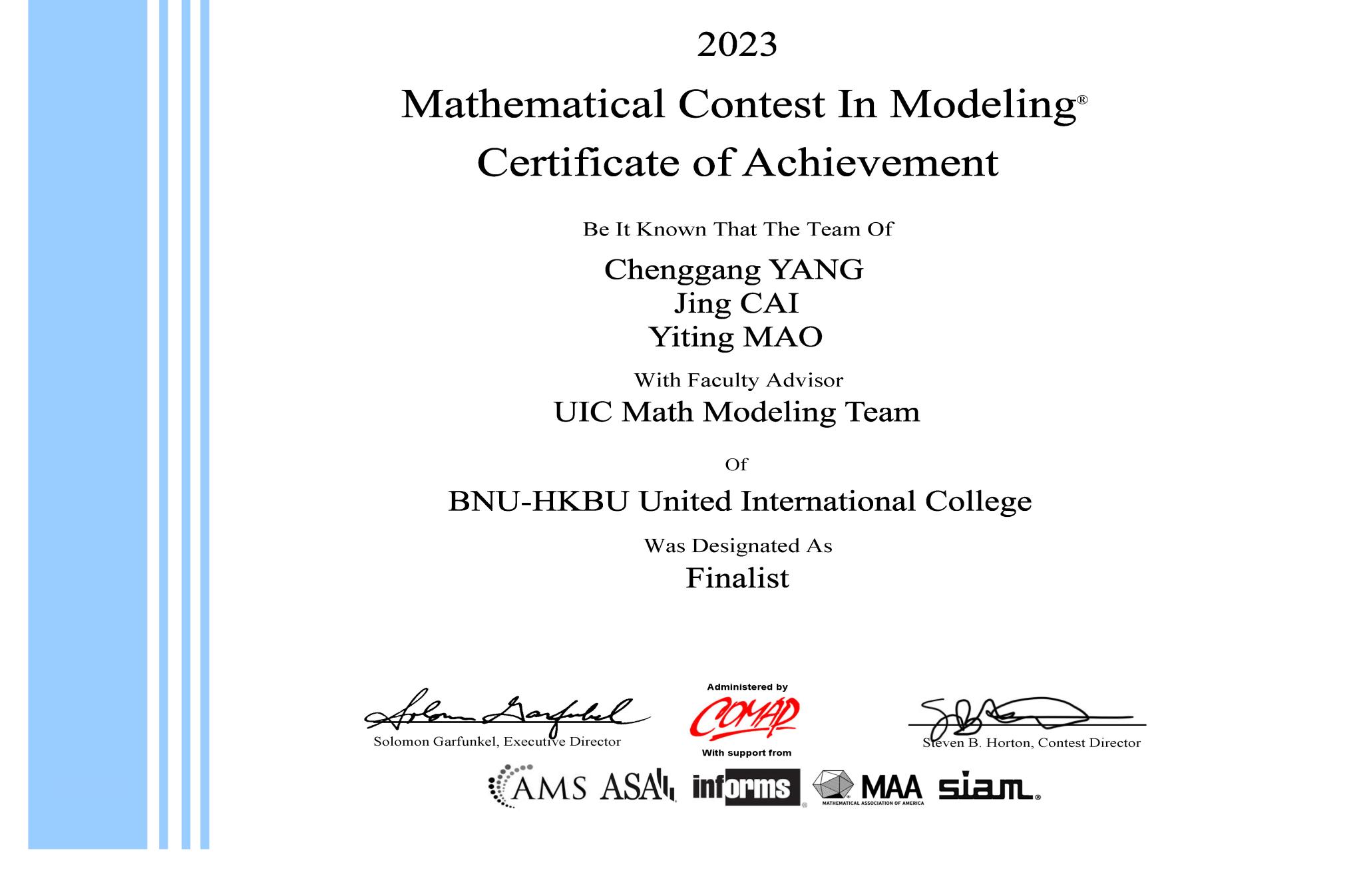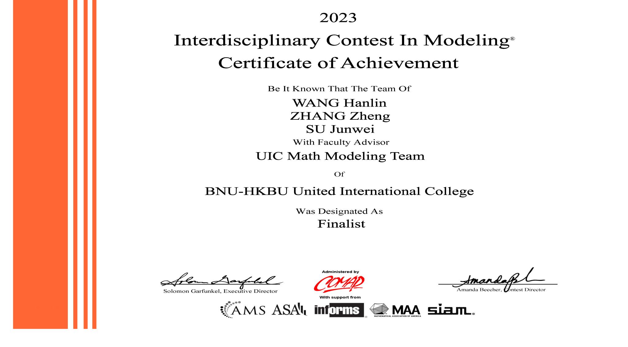 A total of 20 groups of students won awards in the MCM/ICM 2023, including three Finalist, four Meritorious Winnier and 13 Honorable Mention. In the CUMCM 2022, 72 teams from UIC won 74 awards, including two national second prizes, three Guangdong first prizes, 10 Guangdong second prizes, 18 Guangdong third prizes, and 41 winning prizes.