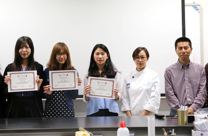 Prof Xu Baojun (right) giving awards to students at the UIC-FST Innovative Food Carnival, Gao Yue (middle) won the "Best Food Award" and "Best Poster Award"