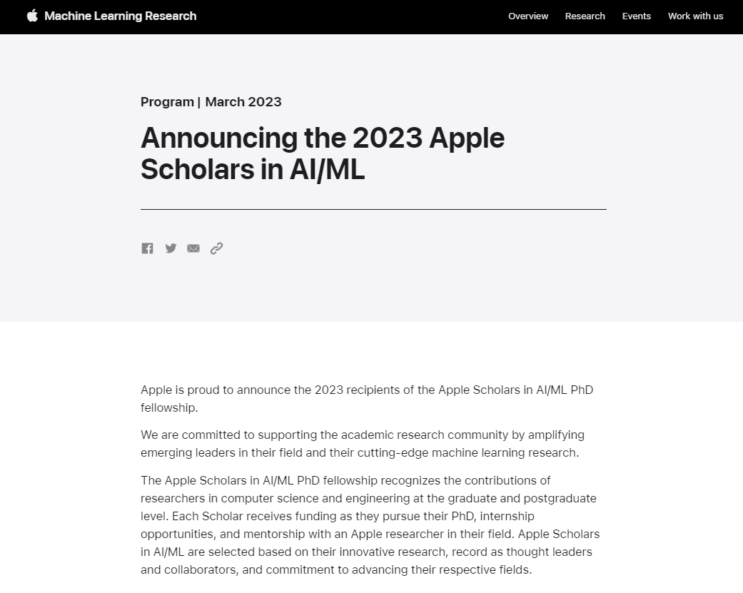 The Apple Scholars in AI/ML PhD fellowship recognises the contributions of researchers in computer science and engineering at the graduate and postgraduate level. Each Scholar receives funding as they pursue their PhD, internship opportunities, and mentorship with an Apple researcher in their field. Apple Scholars in AI/ML are selected based on their innovative research, record as thought leaders and collaborators, and commitment to advancing their respective fields.