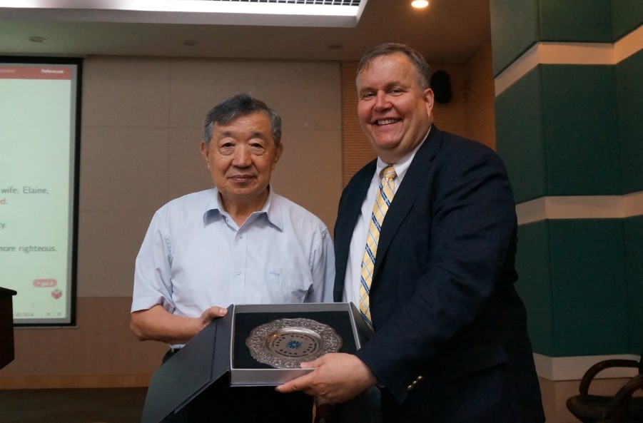 Prof Fang Kaitai, professor with the Statistics Programme of the Division of Science and Technology, presented a souvenir to Prof Fred J Hickernell. The lecture was a Distinguished Lecture organised by the Institute of Statistics and Computational Intelligence, Division of Science and Technology. |