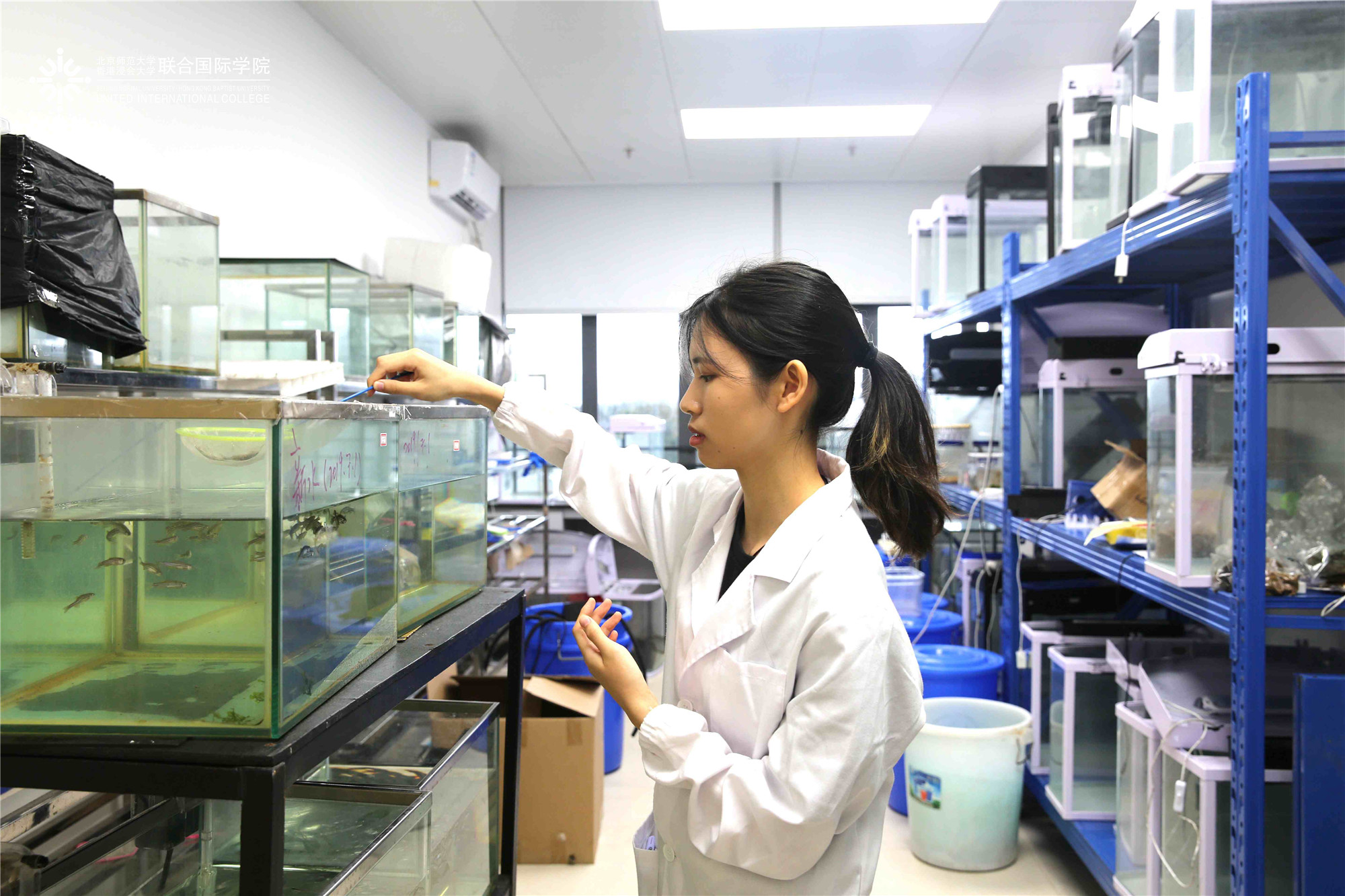 蔡晓彤在实验室养殖斑马鱼