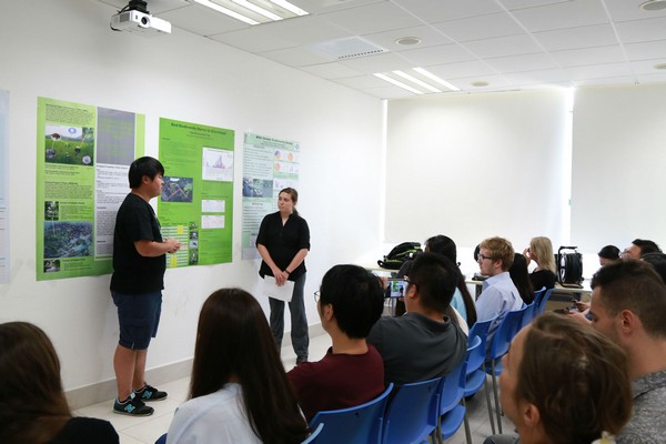 两校学生还展示了斗门稻田生态系统、会同村风水林生态系统、淇澳岛的鸟类多样性、UIC附近溪流的生态等研究结果。另一位导师、三立大学的生物学教授大卫·利伯尔表示,两国学生的展示很精彩,水平很高。这是初次与UIC合作的课程项目,他带领四位学生过来与UIC的学生分组配对,学习“中国的生态学和生态保护”。利伯尔和詹肇泰轮流授课,以珠海的生态环境作为教材,注重体验式学习,频繁去户外观测、调研、取样实验。
