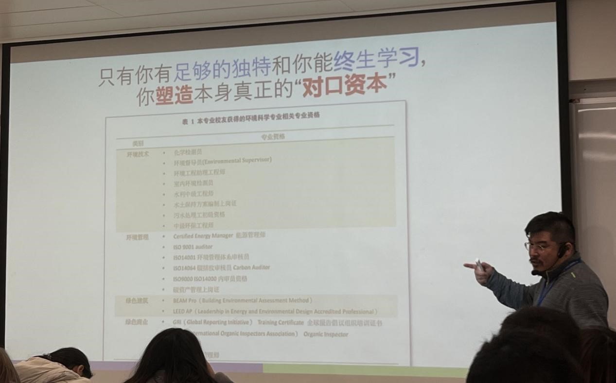 紧接着,詹博士展示了往届优秀毕业生的案例分享,具体说明环境科学毕业生们的人生规划和跨领域能力。随着越来越多的企业着力于发展环保与可持续发展,环境科学毕业生有着非常可观的前景和灵活性。