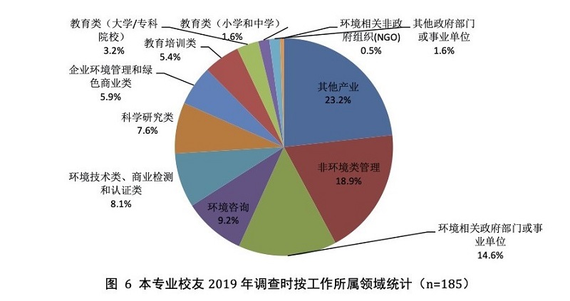 环境科学专业的毕业生在社会有着上多元的专业发展,这从环科校友多样化的工作和所在机构展示了这种优势,毕业生选择环科专业相关事业发展或其他类型事业发展50:50黄金比例。从校友调查结果来看,毕业生就业单位有政府部门、科研院所、著名高校、龙头企业、全球500强企业等等。