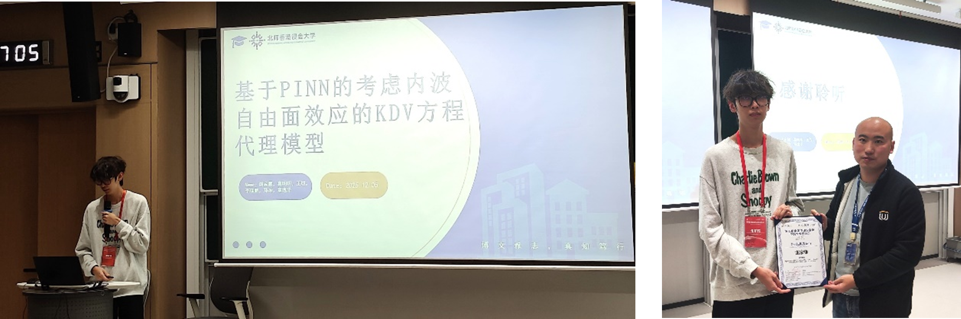This conference focused on hot topics such as flow-induced vibration, flow safety, and low-altitude economy. Five top experts in the field delivered high-level reports, all closely related to national major demands and the cutting-edge of science and technology. The research "A PINN-based surrogate model of the KDV equation considering the free surface effect of internal waves" conducted by XIE Jiayao and ZHANG Yize was successfully selected for the "AI for Flow" session and was presented by XIE Jiayao.
