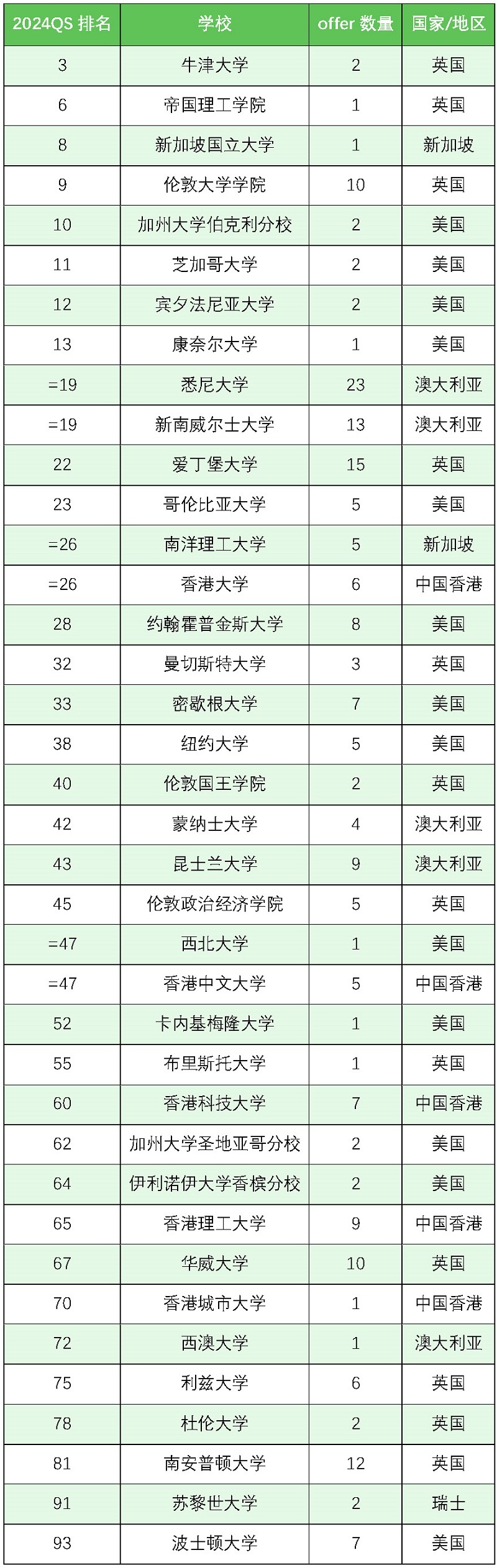 录取院校包括牛津大学、帝国理工学院、新加坡国立大学、伦敦大学学院、加州大学伯克利分校、芝加哥大学、宾夕法尼亚大学、康奈尔大学、悉尼大学等顶尖学府。
