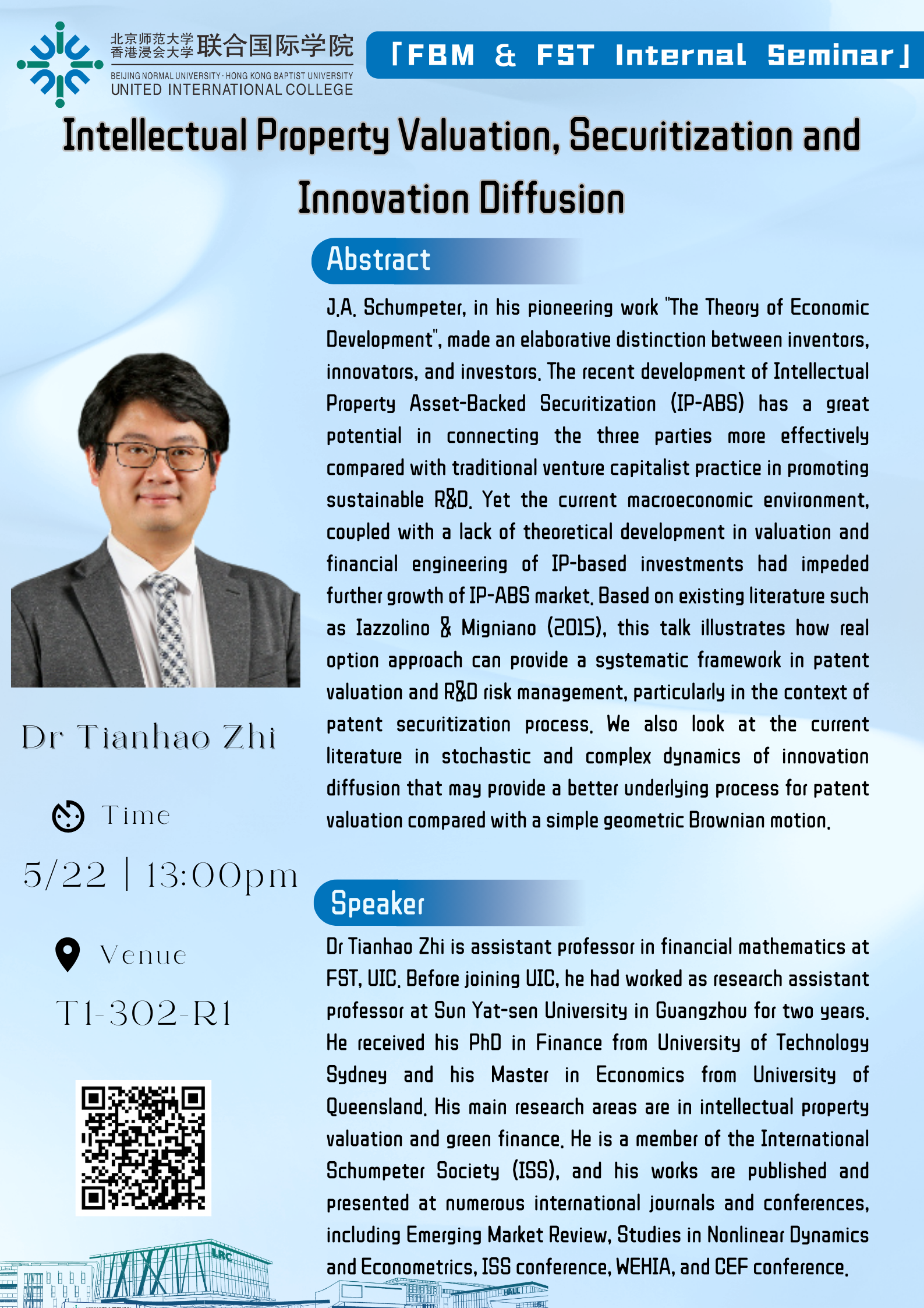 Dr Tianhao Zhi is assistant professor in financial mathematics at DST, UIC. Before joining UIC, he had worked as research assistant professor at Sun Yat-sen University in Guangzhou for two years. He received his PhD in Finance from University of Technology Sydney and his Master in Economics from Unversity of Queensland. His main research areas are in non-linear economic dynamics, valuation of intellectual property, and behavioural finance. His works are published and presented at numerous international journals and conferences, including Emerging Market Review, Studies in Nonlinear Dynamics and Econometrics, WEHIA, and CEF conference.
