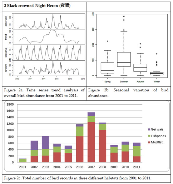 彭小令博士与她的学生们参与了香港渔农署项目“香港米铺自然保护区湿地水鸟和环境监测数据的统计分析”。他们通过时间序列分析,相应分析,广义线性模型,biplot,graphical model等统计方法对香港米铺自然保护区湿地水鸟和环境监测数据的时间、空间分布变化趋势进行研究并展示。