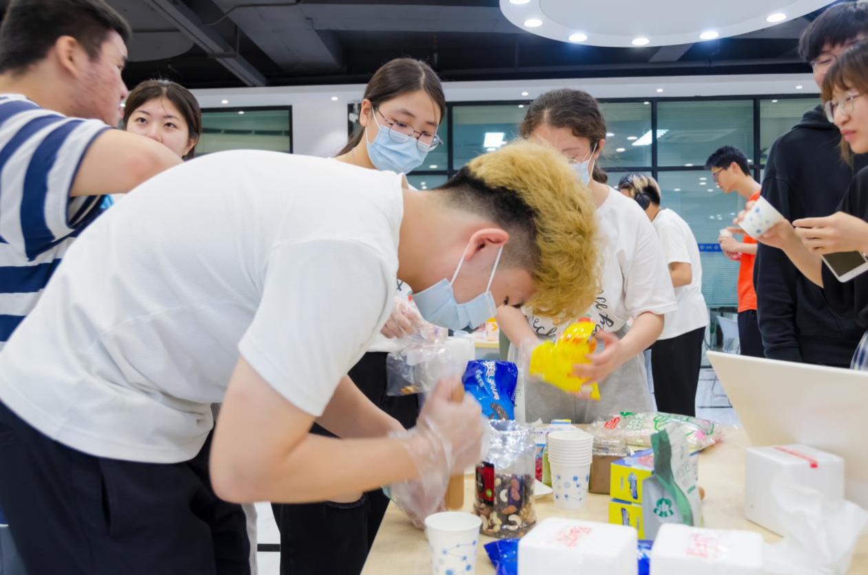 投掷乒乓球游戏的趣味性以及未知食材的“神秘感”,成功吸引不少同学参与。在这轮活动中,乒乓球投入不同纸杯可获得不同食材,参与者可以用得到的食材一起搭配巧克力食用。山楂蘸巧克力你或许听说过,但是甜椒蘸巧克力,西芹蘸巧克力你敢尝试一下吗?“醉翁之意不在酒,在乎山水之间也”,同学们的乐趣不在于获取了什么食物,而是沉浸于游戏的过程。