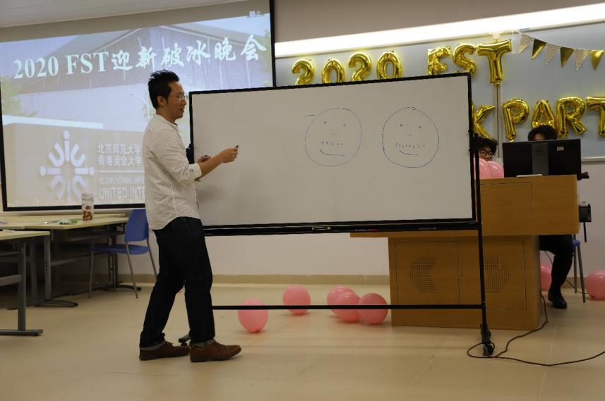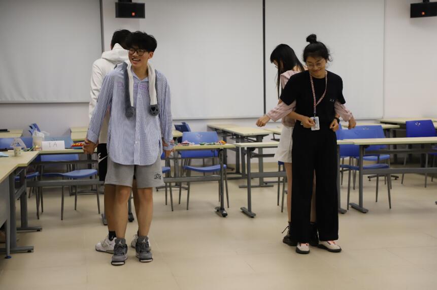 接下来就到了紧张刺激的游戏环节。在夹气球跑的游戏中,参与者需要将气球背对背加紧运送到指定位置,再弄破。助理导师张译方(右前)和李旭(右后)与王俊雄同学(左前)和他的小伙伴(左后)进行了友好的PK。最终“导师组”获得了胜利,而王俊雄同学(右)和他的小伙伴程方立(左)由于PK失败,接受了吃怪味豆的惩罚。怪味豆不同的颜色代表不同的味道,而同一颜色又有2种味道。比方蓝色可能是蓝莓味也可能是牙膏味。第一轮两人根据转盘选择了不同颜色的怪味豆,但是由于没有遇到奇怪的味道,台下观众要求他们选择同样颜色的怪味豆再一次接受惩罚。这一次以程方立吃到了真正的怪味糖豆结束。