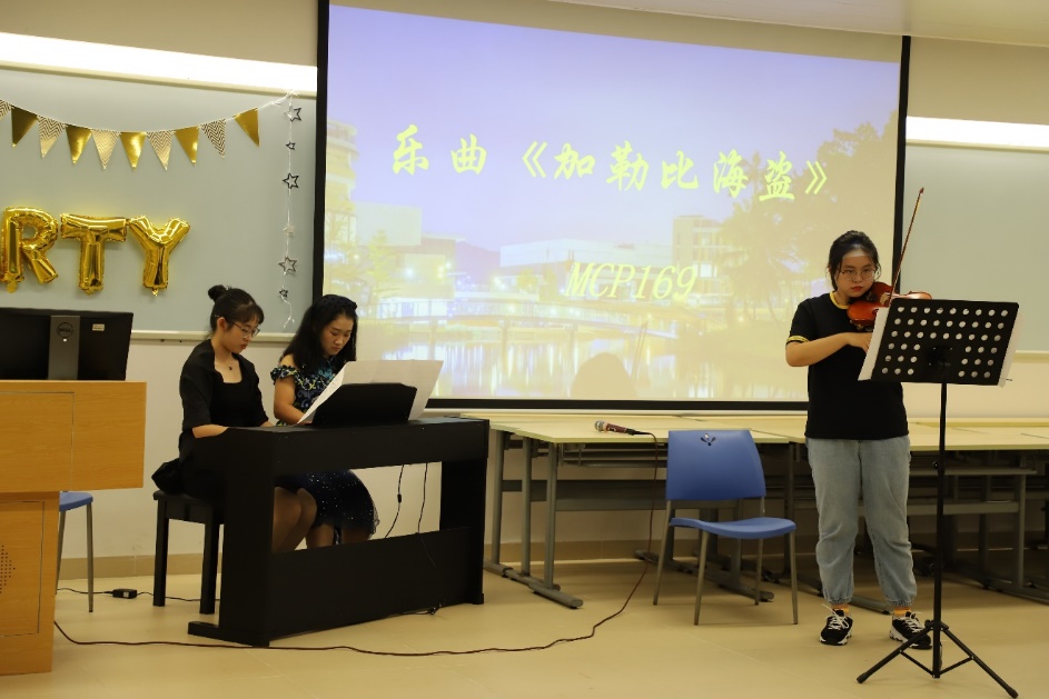 在轻松活跃的气氛中结束了小品,我们迎来了富有感染力的《加勒比海盗》乐器演奏,由MCP169的周沂晓(左一)、李美霖(左二)和苏子靓(右一)演奏。琴声悠扬,仿佛身临其境。四手联弹和小提琴的合奏耗费足月排练,最终展现出了不错的现场效果。