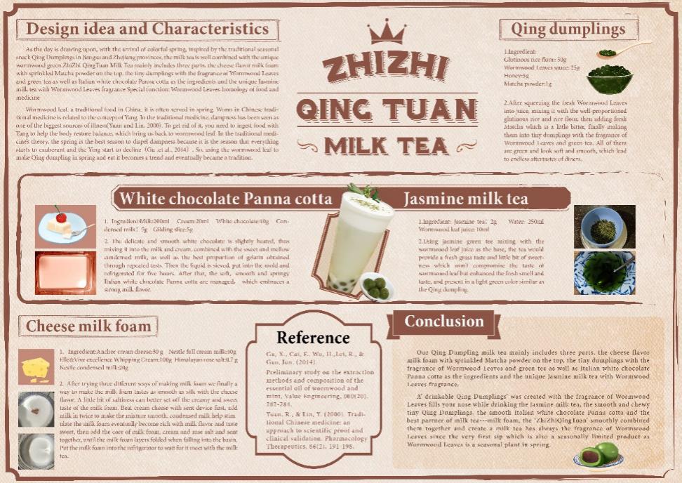 艾叶具有排毒、祛除体内湿气的功效,但艾叶本身的味道十分苦涩,将甜炼乳加入艾叶汁中,便可以中和艾叶的苦味,又能保留艾草独特的香气。茉莉花香也使奶茶具有独属于春天的清香。这款产品不但紧跟当今的消费潮流,还将中华的传统美食文化融入其中。