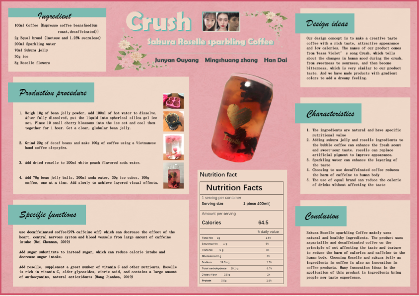 产品名Crush来源于Tessa的歌曲《Crush》,它讲述了心动过程中人的情绪变化,从甜味到酸味再到苦味,产品的口味也以此为灵感。苏打水与苏打水的混合物产生淡淡的甜味,然后再是洛神花产生的微酸,最后便可以品尝到咖啡带来的苦味。与此同时产品具有渐变色,增添了梦幻般的感觉。为了制作出具有浓郁口感,诱人外观和低热量的创意咖啡,产品含有许多天然物质——樱花果冻和洛神花均是对人体有益的天然植物元素。食用洛神花可以减轻体重和降低血压,食用樱花果冻可以调理皮肤和缓解疲劳。就产品外观与口感方面,红色的洛神花可以增添色泽,樱花可以增加甜酸味和香气。