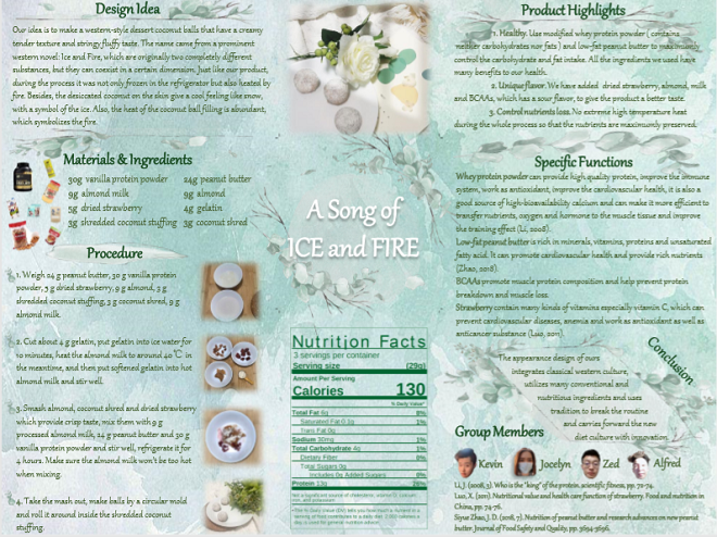 健身有时候是索然无味的,这款椰子球的设计理念基于健身爱好者的角度。椰子球中融入健身补充剂,让无味的健身补充剂变成好吃的能量椰子球,并起名为冰与火之歌,因为椰子球制作过程中包含冷冻和加热等步骤,并且椰子球馅料热量高。