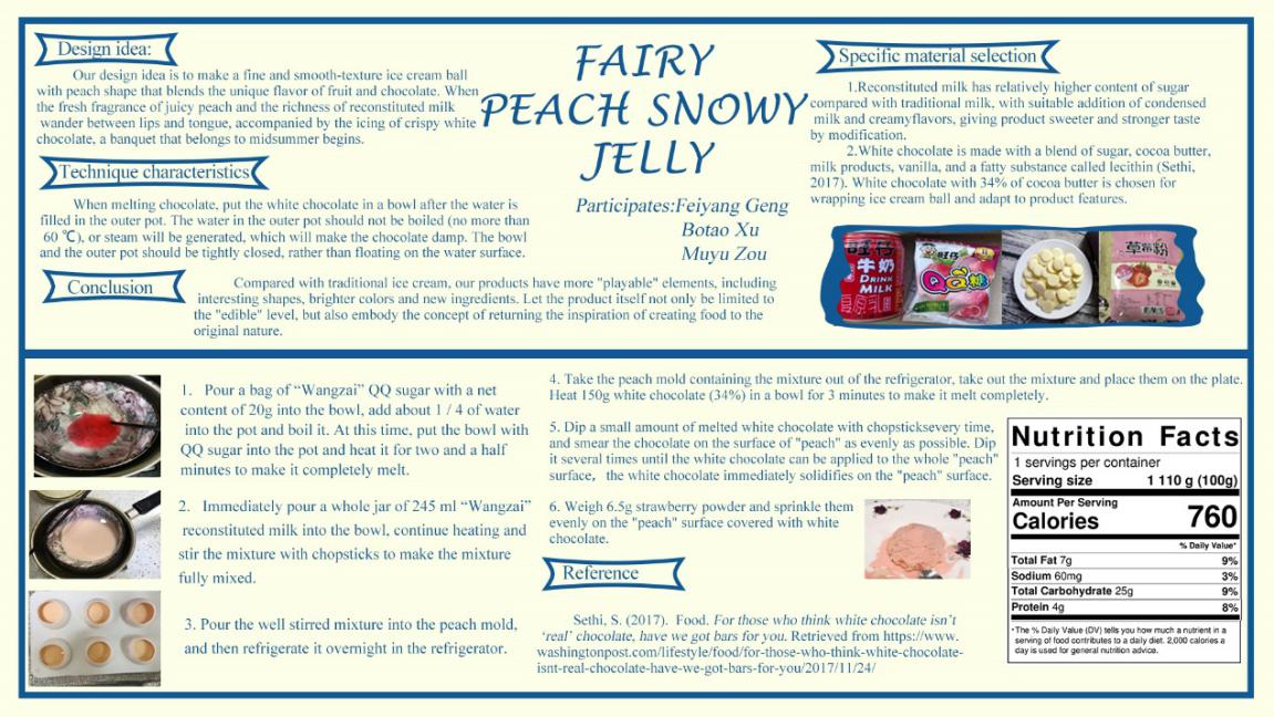 特殊时期,即使不能返校,同学们对课程学习的热情丝毫没有减少,仍然在家中研发出各式各样的创新食品。从“TAKOTACO-AVOCACO”到“芝芝青团”再到“玫瑰果园”无一不表现出同学们非凡的创造力。来自11个小组的作品各有特色,诚意十足,既有零食甜点、奶茶饮品、还有小食前菜,虽不能亲自到场品尝,但是精美的产品图一定可以打破距离的限制,隔着屏幕就能感受到美味的食品,也感受到食品科学的魅力。