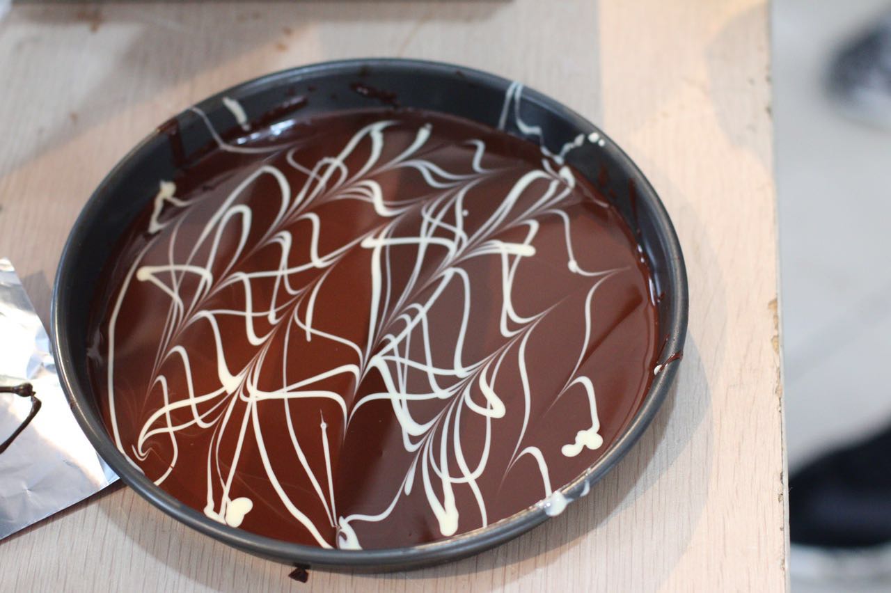 与往年不同的是, 今年的巧克力节除了传统的巧克力DIY之外, 还新增了巧克力薄脆和巧克力喷泉。巧克力薄脆是将一定量的黑巧克力浆倒入烤盘中并使其平铺,待巧克力稍凝固时挤入白巧克力浆,再用竹签在巧克力中划线,撒上研磨好的薄荷糖碎,冷冻凝固即可。