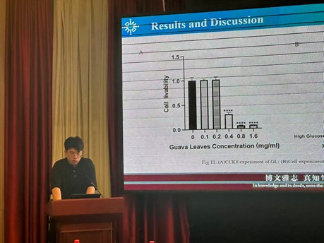 据悉,韩宾乘的研究工作在导师徐宝军教授的悉心指导下开展。本次会议上,他以 “番石榴叶抗二型糖尿病的分子机制” 为主题进行学术报告,聚焦番石榴叶水提物的治病功效,将理论研究与当下新型研究方法有机结合,通过严谨的实验设计与数据分析,深入剖析了番石榴叶在对抗二型糖尿病方面的潜在价值与作用机理。其报告内容兼具科学性、创新性与实用性,不仅展现了对专业领域的深入探索,也为相关疾病的防治与食品功能研究提供了新的思路,得到了会议评审专家的高度认可与一致好评。
