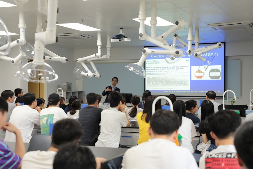 2019年4月26日,来自美国罗德岛大学BBRL (Bioactive Botanical Research Laboratory) 的马航博士应徐宝军教授的邀请为北师港浸大食品科学与工程专业(简称:FST)学生带来关于枫叶在植物化学和生物学中的研究成果及其应用的专题讲座。讲座介绍了枫叶糖浆提取物中化学成分与其生物功能及其在食品和化妆品行业中的应用和商业推广等。