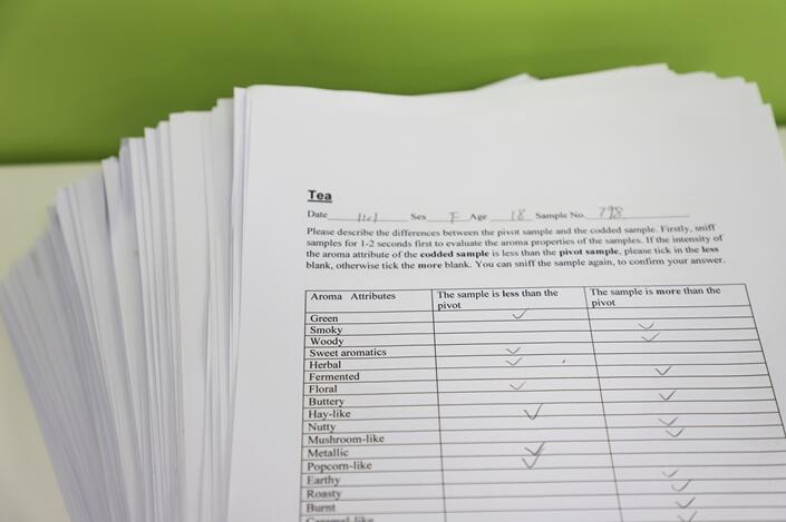 在实验室中,参与者认真品鉴每一款茶和咖啡,并且记录闻香、品香的感觉,进行专业评测。
