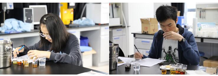 FST的老师们为同学们准备了6种不同烘烤工艺的咖啡以及7种不同发酵工艺的茶(白茶、绿茶、乌龙、红茶)。本课程采用食品感官科学中最新快速描述方法(Pivot Profile & CATA)对咖啡与茶进行感官评定。在学习标准食品感官评定方法之余,了解不同加工工艺对咖啡与茶风味的影响。在茶香与咖啡香的陪伴下,同学们感受着味觉与嗅觉的冲击。