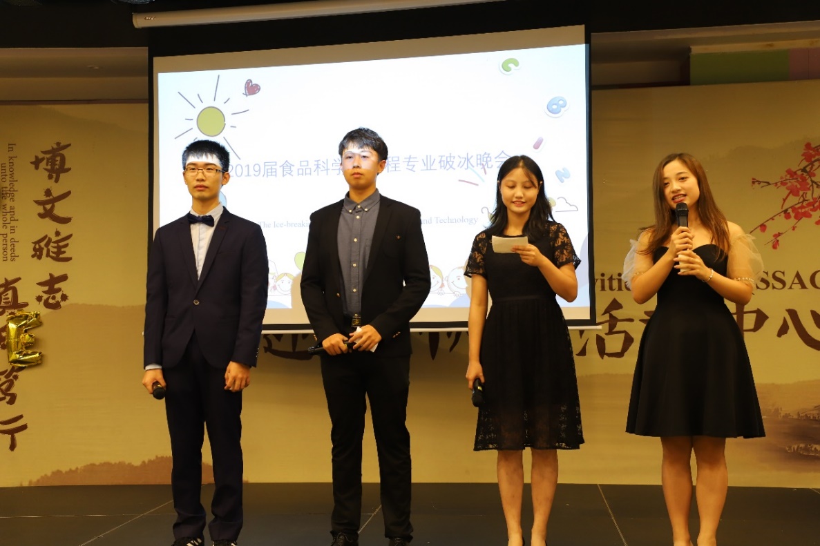 2019年9月19日晚,食品科学与工程专业的新生破冰晚会在师生活动中心举行。西装革履的男主持人,与美丽大方的女主持人,共同将晚会拉开序幕。
