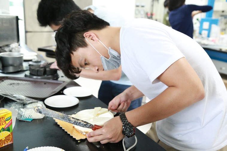 活动当天,美食制作小组的成员们对前来品尝的师生们讲解自己的创意和感官评价方法。制作“光.萌”酸奶蛋糕的同学介绍道,蛋糕分为黑白两块,黑色部门是无糖无油的配方,非常健康也很难制作,“我们希望能让大家吃到健康的食品,每份蛋糕都有两块也更方便分享。”