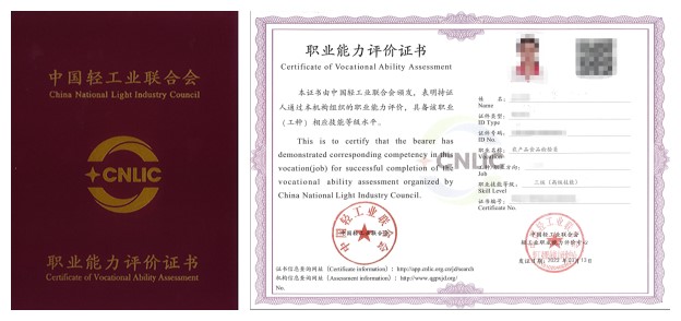 理论与实操分别满60分以上及格,经考试合格者,颁发中国轻工业联合会统一印制的《职业能力评价证书》。证书全国范围统一编号,网上注册登记管理,国家承认,全国通用。