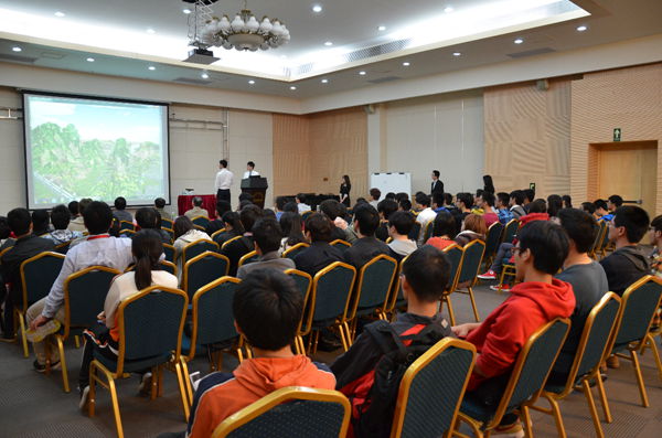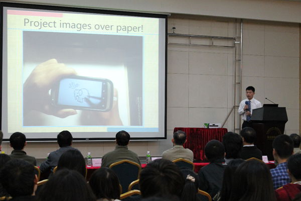 祝捷会还有来自第四届广东省数字图像图形创作大赛获奖学生的分享。广东省数字图像图形创作大赛由广东省图像图形学会主办,共分动画、动漫游戏角色、平面设 计、PC游戏、手机游戏、图形互动和图像处理算法7个类别。在广东省17所高校上交的472份作品中,由我校大四计算机与科学专业沈培林、傅旭、蔡冀、章 毅远、卓晨合作制作的“Motion Controlled First Perspective Adventure Game”获得了PC游戏类一等奖。另一组由大四计算机与科学专业陈琢、邱健、宋玉浩合作完成的“Shadow Puppetry with Kinect Sensor”获得图像互动类二等奖。指导老师张慧博士表示,学生们的灵感来自艺术与科技的结合。