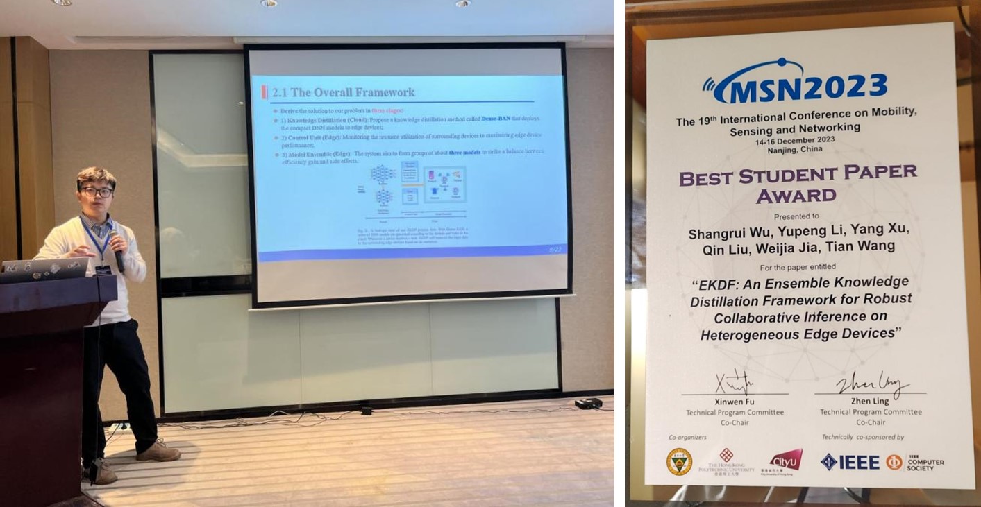 2023年12月14日,The 19th International Conference on Mobility, Sensing and Networking(MSN 2023)在南京召开,UIC理工科技学院计算机科学系博士生吴尚睿荣获MSN 2023 Best Student Paper Award,指导老师王田教授,该奖项为此次大会唯一最佳学生论文奖。吴尚睿是UIC计算机科学系2022级博士生,研究领域是协作边缘智能。