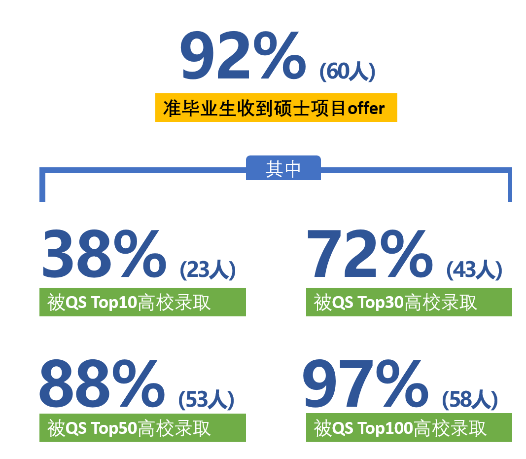 北师港浸大理工科技学院统计学专业2024届准毕业生共65人。截至4月17日,据不完全统计,统计学专业60位(92%)准毕业生共收到200份来自海内外高校的录取通知书。其中,收到2024年QS世界大学排名前100高校offer共166份(占比83%),排名前50高校offer共111份(占比56%),排名前30高校offer共75份(占比38%),排名前10高校offer共31份(占比16%)。在60位已收到offer的申研学生中,38%被2024年QS前30高校录取,72%被前30高校录取,88%被前50高校录取,97%被前100高校录取。