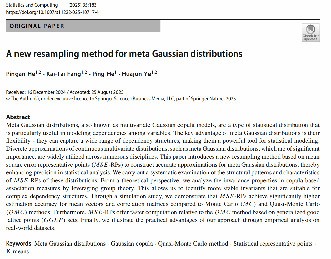 近日,北师香港浸会大学(BNBU)理工科技学院统计与数据科学系概率论与数理统计专业2023级博士生何平安,以第一作者身份在国际一流统计期刊《Statistics and Computing》上发表了题为《A new resampling method for meta Gaussian distributions》的研究论文。