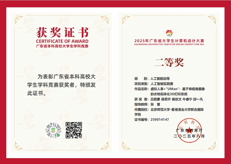 近日,2025年(第18届)中国大学生计算机设计大赛获奖名单公布,BNBU理工科技学院计算机科学系吕君豪、侯思齐、谢启文、牛睿宁以及工商管理学院会计系邱一凡组成的团队的作品《虚拟人享+“UMan”:基于单视角图像的衣物实体化3D打印系统》荣获大赛国赛二等奖。