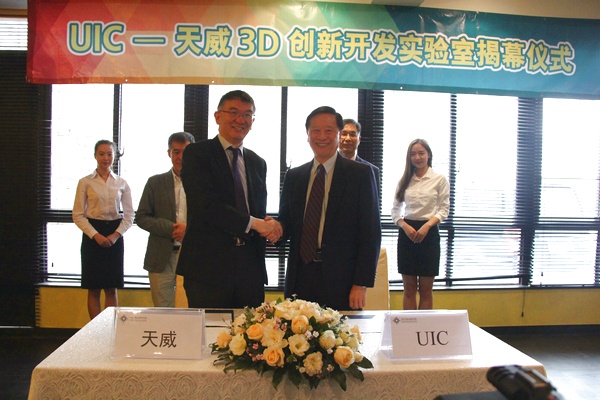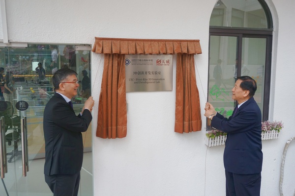 3D创新开发实验室位于文化小镇四栋一楼。天威捐赠了十台不同型号的3D打印机及3D样品,供UIC开展教学、科研和开发等使用。当天,天威控股有限公司董事贺良梅与吴清辉校长签署了捐赠协议书,并共同为实验室揭牌。