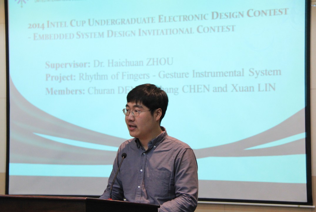 获奖学生代表林暄同学现场为嘉宾和观众们详细讲解了他们的参赛作品《指尖旋律——手势音乐演奏系统》(rhythm of fingers)。他以流利的英语介绍了创意的来源、制作的过程以及所采用的技术。