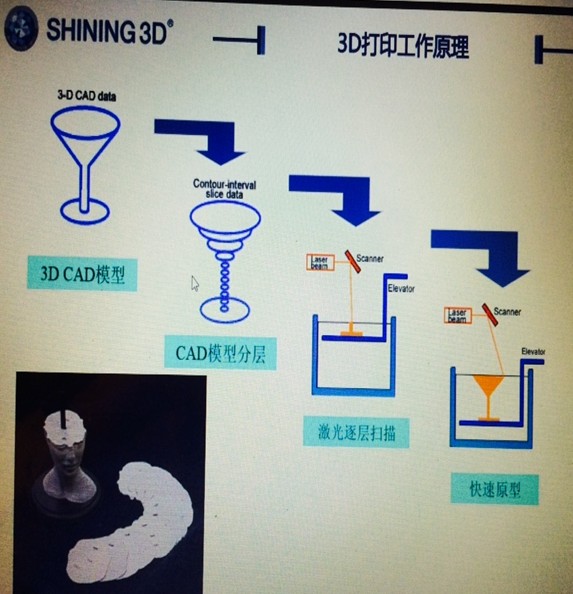 讲座中,同学们了解到了3D打印的原理:首先生成3D CAD模型, 进行CAD模型分层,其次是激光逐层扫描,最后快速地产生了原型。