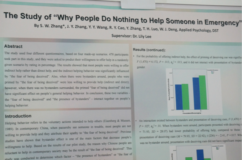 大三应用心理学专业的张舒雯同学与另外六名小 组成员因为深受“小悦悦”等“见死不救”事件感染,于是决定深入调查到底是什么原因导致大家“见死不救”。张舒雯表示,实验小组在珠海城轨北站附近和北师大珠海分校内模拟了“救人”场景,由一名同学扮演在路边晕倒的病人,另一名同学在一旁记录并观察每一个路人的不同表现,以问卷的形式访问其原因,通过对30余名路人的问卷调查,再分析调查数据,得出了“救人与文化程度没有相关性”的 结论。
