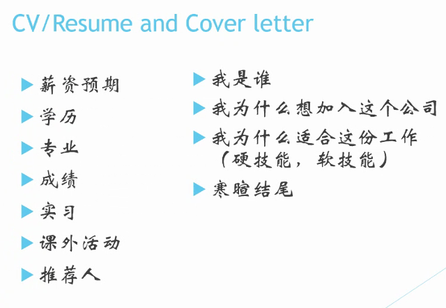 其次,曾寰嵩学长向我们分享了他在香港求职面试方面的心得。对于简历准备方面,他建议大家同时准备英文和中文两份简历,一般把英文简历放在前面中文放在后面。在求职简历内容上,曾寰嵩学长提到大多数同学容易忽略推荐人和到岗时间这两方面的内容。学长推荐大家可以在简历上写一到两个在校熟悉的老师或者实习单位的负责人,因为一些单位想通过与推荐人沟通来了解你平时在校的表现情况。之后,他介绍了简历一般需要包含的内容,并且建议简历应具备简洁精炼的特点。在这里,学长着重说明Cover Letter提到重点即可,内容不需太多;CV精简到一两页即可。而且CV和Cover Letter不要套用模板,应该针对不同公司的需求进行不断修改。