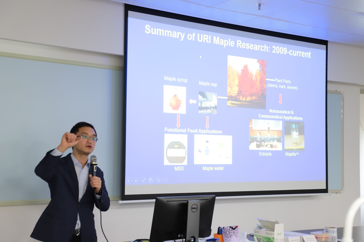 2019年4月26日,来自美国罗德岛大学BBRL (Bioactive Botanical Research Laboratory) 的马航博士应徐宝军教授的邀请为北师港浸大食品科学与工程专业(简称:FST)学生带来关于枫叶在植物化学和生物学中的研究成果及其应用的专题讲座。讲座介绍了枫叶糖浆提取物中化学成分与其生物功能及其在食品和化妆品行业中的应用和商业推广等。