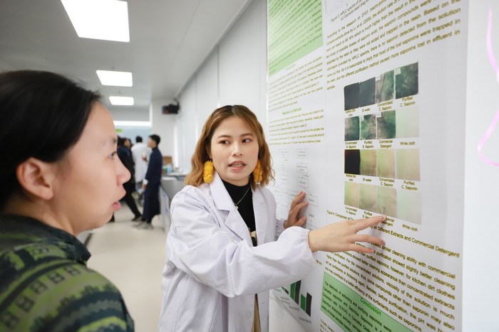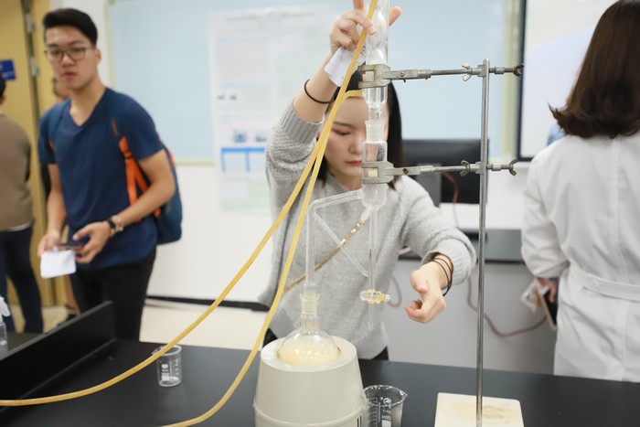走进位于6层的8间环科实验室,只见身着白大褂的同学为参观者耐心介绍各式各样的实验仪器及其应用。8间实验室可研究的范围包括环境科学研究、环境技术、化学、微生物培养及发酵、先进分析仪器、化学试剂配制及存储、水产养殖和生物学及生物技术。