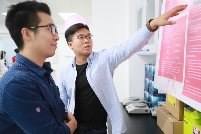 观察显微镜下的微生物、蒸馏离析技术、杂质过滤等等简单又吸引力十足的小实验,圈粉了一众师生。除了实验器材的展示,也有来自环境科学大四同学的课题展示。张本深同学研究了以深圳为例:共享单车是否真的“低碳”?这些与环境休戚相关的话题也引来师生的围观,听听这些“环境守护者”的研究心声。