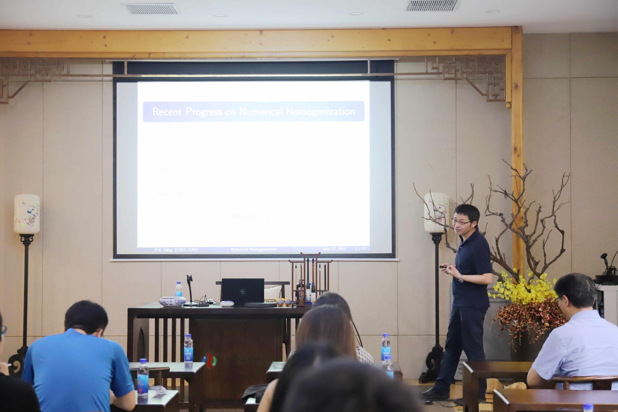 在演讲中,明教授介绍了数值均一化的两个方面:一是发展快速算法来检索有效矩阵,一是如何计算局部宏观尺度信息。他提出了一种同时针对这两个量的hybrid方法,并在没有正则性假设的情况下,得到了误差估计,并用大量数值算例验证了该方法的准确性和有效性。