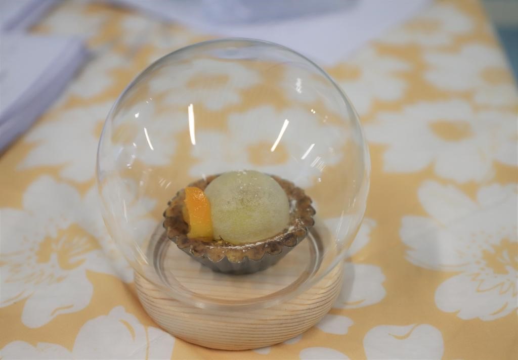 下午一点三十分,“瑰莉之夏”、“可甜可咸的布利尼”、“柑橘星球”、“桂馥芋香”等色香味俱全的美食纷纷现身。“反季蒙布朗”, 来自法国的秋天与来自纽约的奇思妙想,竟在相隔数千公里外的广东珠海进行了反季杂交。没有冬日的珠海,就让清爽的反季蒙布朗带给你温柔夏日。“多谷披萨” 饼底由土豆、红米、鹰嘴豆、青稞、葵花子以及南瓜子混合制作而成,在提供所需碳水化合物同时南瓜子和葵花子所富含的优质脂肪酸能够提供更佳的饱腹感。师生们被产品精致的造型、诱人的香气以及令人眼前一亮的创新想法所吸引,每个人都迫不及待地去品尝自己心仪的产品。