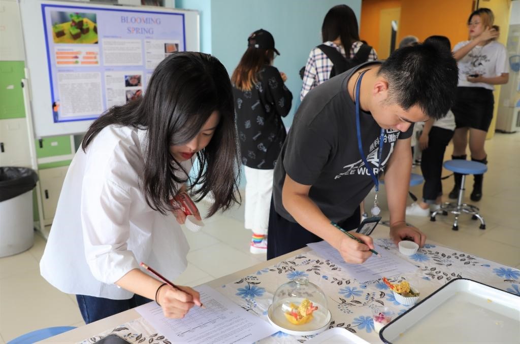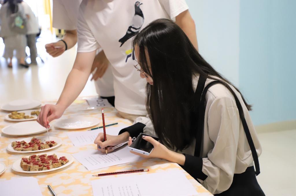 在充满香气的T8五楼, 师生们在品尝过后需对产品进行感官评价,写下他们对产品的感受和建议,而老师们可以为自己喜欢的创意食品投上一票。 现场的所有作品都给参与者们留下了深刻印象,理工科技学部院长黄华雄教授也沉浸在美食的世界中,被食品的魅力征服。